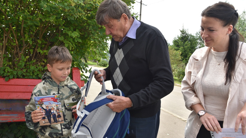 Мальчику Павлу из посёлка Большая Сестра рюкзак и открытку вручил депутат Совета депутатов округа, председатель местного Совета ветеранов Николай Солонец.
