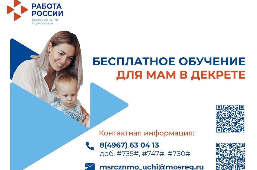 Обучение по направлению Кадрового центра Подмосковья для женщин в отпуске по уходу за ребенком до достижения им возраста 3-х лет и зарегистрированные на территории Московской области могут бесплатно обучиться новой профессии или повысить квалификацию.