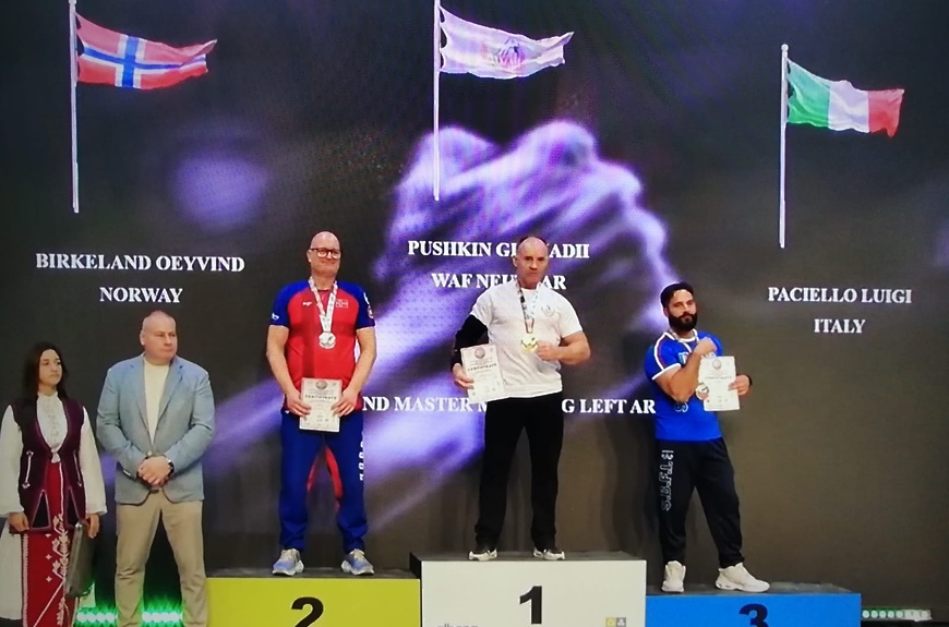 Ярослав Горячев выступал на первенстве юниоров в категории до 55 кг. В тяжелой борьбе с опытными соперниками Ярослав стал третьим на левой руке. А заслуженный и опытный Геннадий Пушкин в категории "гранд-мастер" до 90 кг. в поединках с шестнадцатью соперниками взял в итоге золотую медаль Чемпионата, став первым на левой руке.