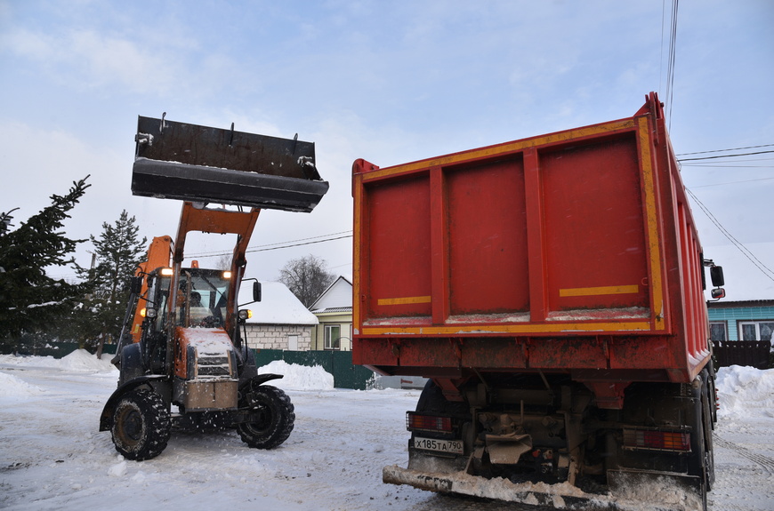 Сотрудники «Благоустройства» ежедневно вывозят снег с улиц посёлка Лотошино. Для работ используется трактор, который при помощи ковша убирает снежные кучи и загружает их в грузовик, который в свою очередь отвозит снег на снегосвалку.