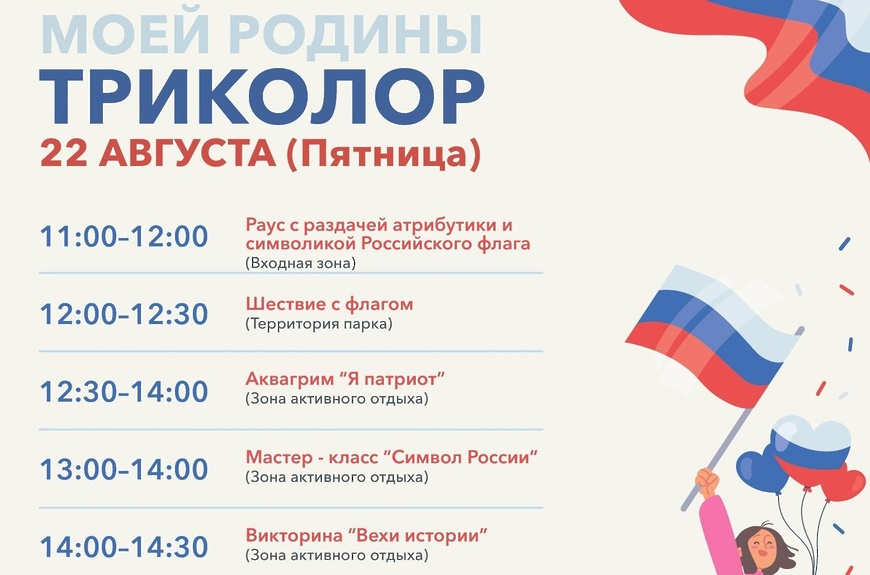 "Моей Родины Триколор" - именно так называется праздничное событие, которое пройдёт 22 августа - причём активности по душе найдутся в этот день в парке и для взрослых, и для детей.
