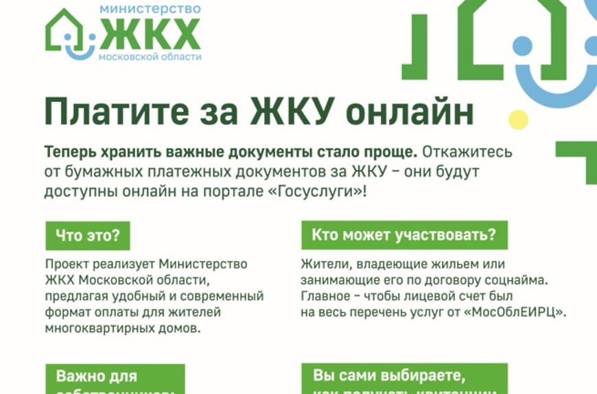 Министерство жилищного-коммунального хозяйства Московской области запустило пилотный проект, который позволит собственникам получать платежные документы в электронном виде на региональном портале Госуслуг (uslugi.mosreg.ru/epd)