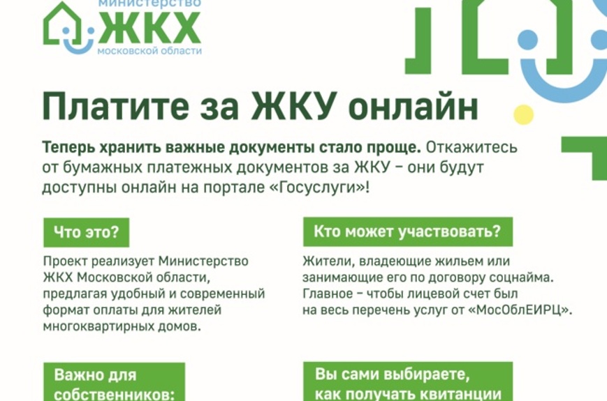 Министерство жилищного-коммунального хозяйства Московской области запустило пилотный проект, который позволит собственникам получать платежные документы в электронном виде на региональном портале Госуслуг (uslugi.mosreg.ru/epd)