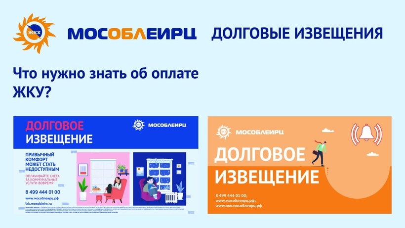 На оранжевых или синих долговых извещениях МосОблЕИРЦ указаны номера телефонов, по которым можно уточнить сумму, период и способ оплаты задолженности: 8 936 501 73 09, 8 919 992 38 28. Наличие и сумму долга можно также проверить через контактный центр по телефону 8 499 444 01 00, через личный кабинет на сайте МосОблЕИРЦ или мобильное приложение «МосОблЕИРЦ Онлайн».