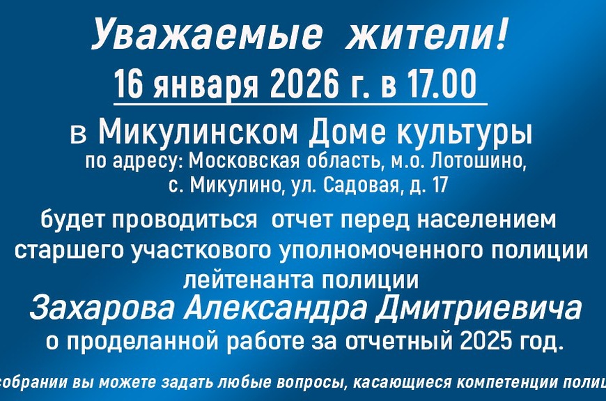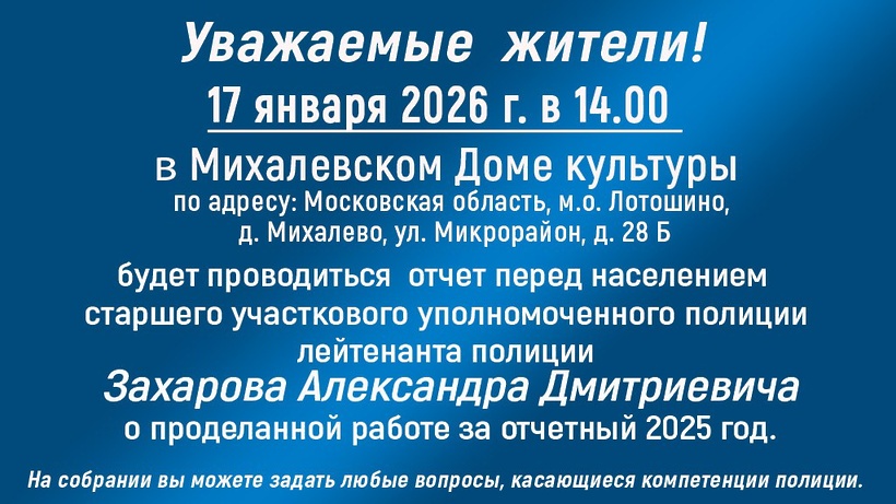 Отчеты о работе участкового уполномоченного полиции пройдут в Микулино и Михалево 16 и 17 января