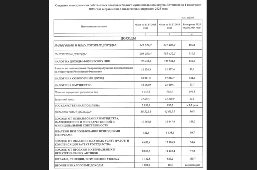 За 1 полугодие 2025 года в бюджет муниципального округа Лотошино поступило 241 622,7 тыс. рублей налоговых и неналоговых доходов, что превышает уровень аналогичного периода 2024 года всего на 6,2 процента.