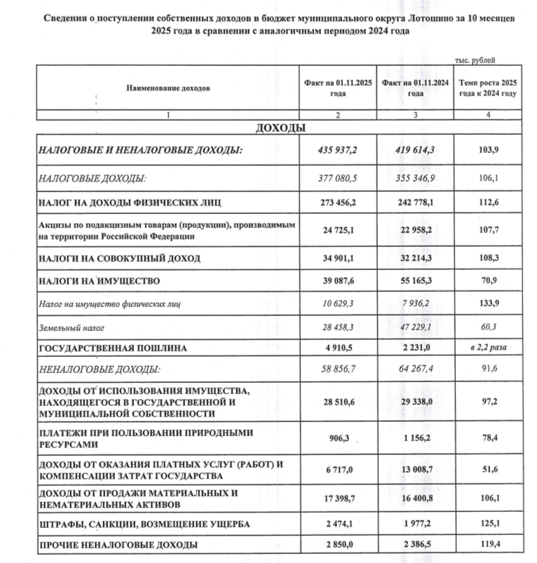 За 10 месяцев 2025 года в бюджет муниципального округа Лотошино поступило 435 937,2 тыс. рублей налоговых и неналоговых доходов, что превышает уровень аналогичного периода 2024 года на 3,9 процента.