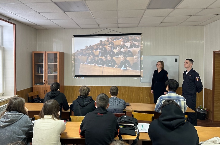 Полицейские и общественница довели информацию о порядке поступления в юридические вузы системы МВД России, особенностях учебного процесса и различных направлениях деятельности сотрудников полиции. На встречу был приглашен слушатель 5-го курса Московского университета МВД России им. В.Я. Кикотя младший лейтенант полиции Н.Д Барабанщиков, который проинформировал школьников об организации учебного процесса, сроках обучения и денежном довольствии, предусмотренном курсантам.