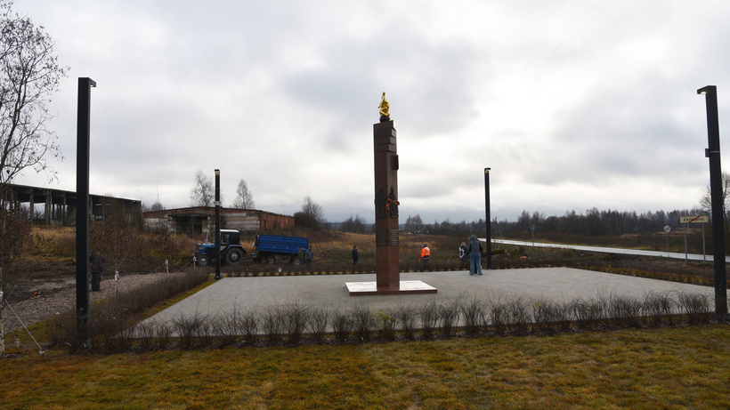 Рабочие фактически завершили строительство стелы «Населённый пункт воинской доблести» в деревне Калицино. Сотрудники «Благоустройства» приводят в порядок территорию вокруг монумента — пилят и вывозят аварийные деревья, кустарники.