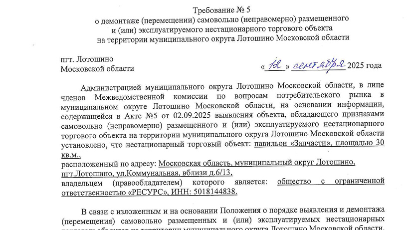 Требование о демонтаже нестационарного торгового объекта по адресному ориентиру: Московская область, пгт. Лотошино, ул. Коммунальная, вблизи, д. 6/13