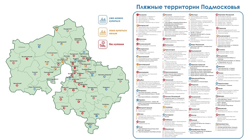 В Московской области работают 164 места отдыха у воды, включая подходящие для купания. Найти ближайший пляж можно на карте.
