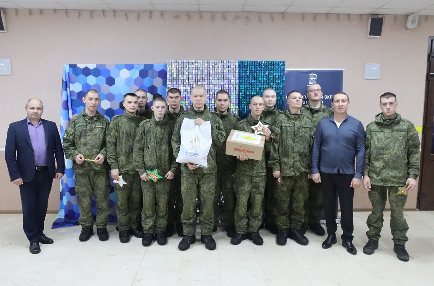 Трогательным моментом стало вручение праздничных открыток, подготовленных детьми. Они лично вручили их военнослужащим. Также бойцам были вручены подарки от администрации округа, депутатского корпуса и Единой России.